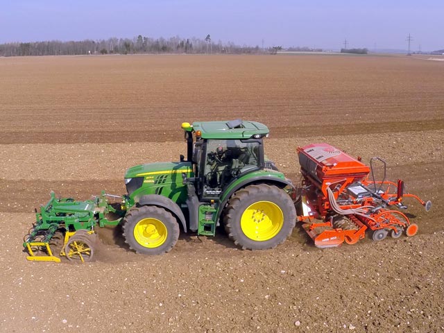 Die Drillsaat erfolgt mit leichtem und doch leistungsfähigem 4-Zylinder-Schlepper mit 3m Kreisel-Drill-Kombination